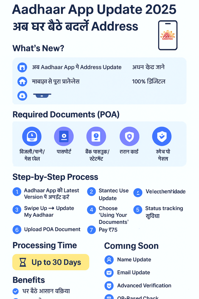 आज के डिजिटल युग में नागरिकों के लिए सरकारी सेवाएँ ज्यादा सरल और स्मार्ट हो रही हैं। इसी कड़ी में UIDAI (Unique Identification Authority of India) ने अपने Aadhaar App Update 2025 पेश किया है, जिससे अब आप घर बैठे ही अपने आधार कार्ड पर पता (Address) बदल सकते हैं इस ब्लॉग में हम आपको विस्तार से बताएँगे कि यह नया फीचर क्या है, कैसे काम करता है और पूरी प्रक्रिया को स्टेप-बाय-स्टेप समझेंगे ताकि आप आसानी से अपना पता बदल सकें।